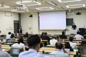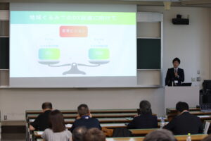 開会にあたり、岡山大学 研究・イノベーション共創機構産学官連携本部の舩倉 隆央副本部長が、「デジタル×サステナビリティ 共創の力で拓く未来社会~学生起点のイノベーション創出に向けて~」と題した基調講演を行いました。講演では、デジタル技術が地域社会に及ぼすインパクトや、次世代人材が担う共創型イノベーションの可能性、そして持続可能な社会構築に向けた大学の役割について、具体的な事例や展望を交えて語られました。